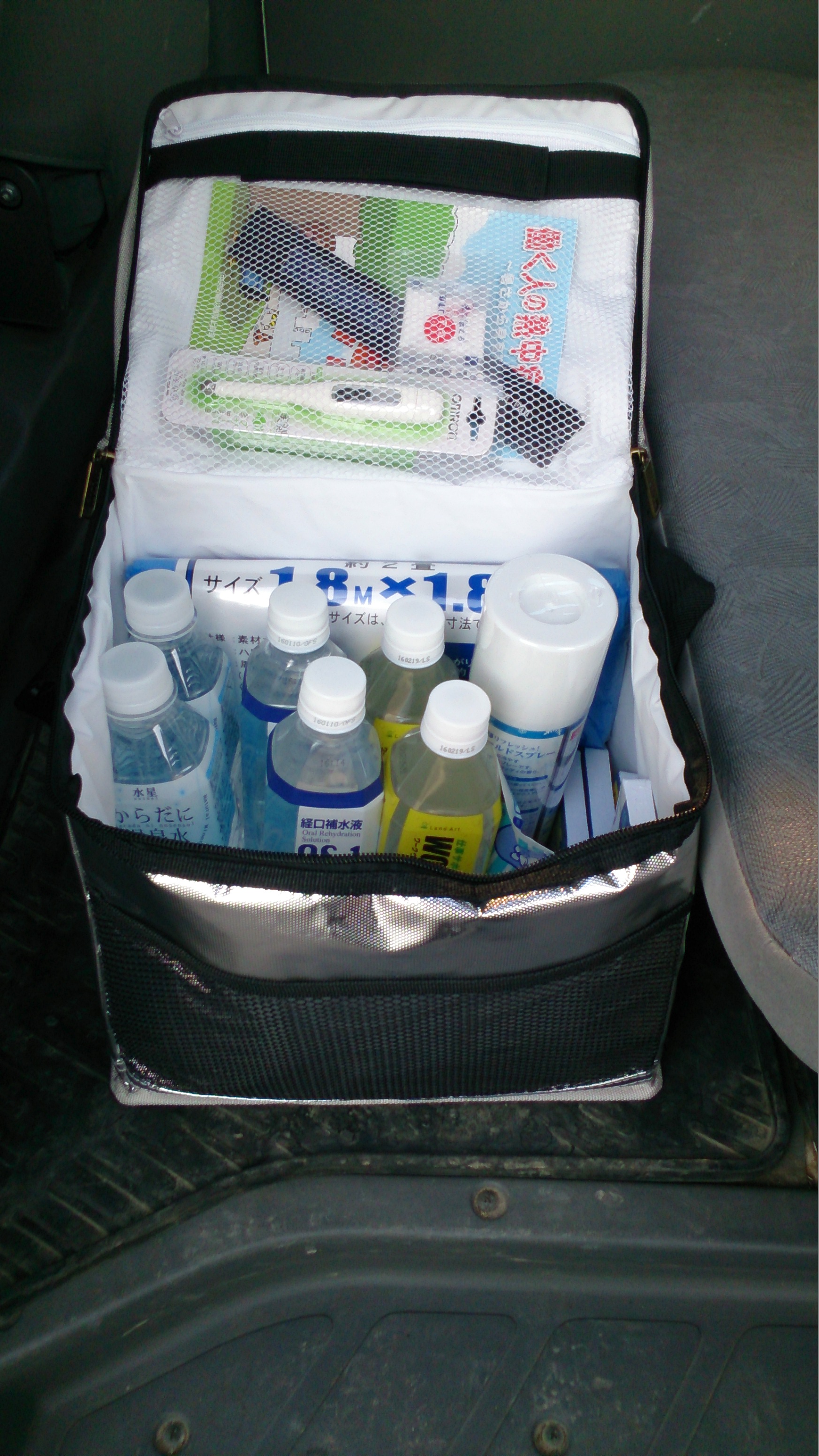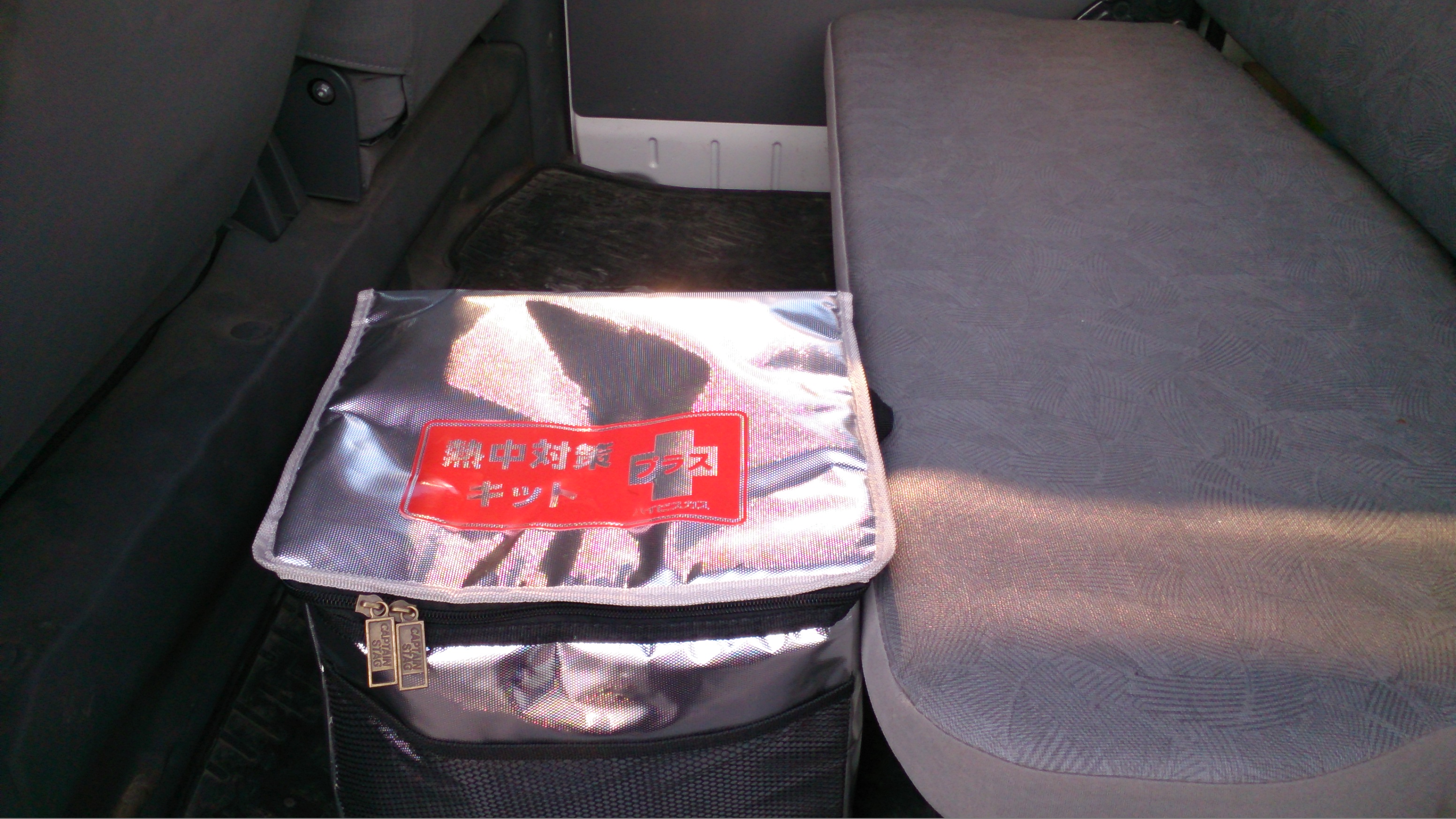 豊岡の井原です。激暑が始まりました…車で動き回る毎日ですが、カーエアコンから冷たい空気が出ないくらいに激暑ですね。夕方にならないと冷たい空気に変わりません…風のある外の方が、ましな時もあります。一人で動き回っているので、車の中でも、もしもの時の為にこんな物を常備してみました。「熱中対策キット」です。