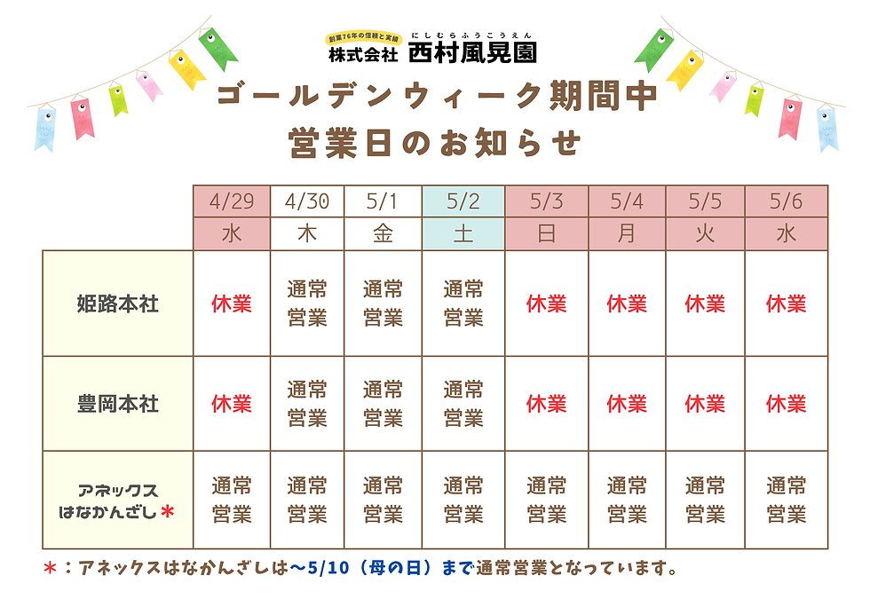 期間中は営業日が通常と異なり、ご不便をおかけいたしますが、何卒ご理解のほどよろしくお願い申し上げます。